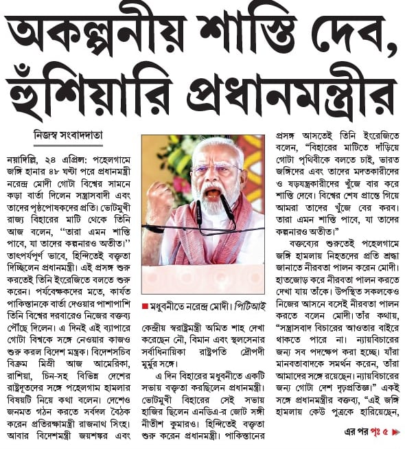 নয়াদিল্লি, ২৪ এপ্রিল: পহেলগামে জঙ্গি হানার ৪৮ ঘণ্টা পরে প্রধানমন্ত্রী নরেন্দ্র মোদী গোটা বিশ্বের সামনে কড়া বার্তা দিলেন সন্ত্রাসবাদী এবং তাদের পৃষ্ঠপোষকদের প্রতি। ভোটমুখী রাজ্য বিহারের মাটি থেকে তিনি আজ বলেন, ‘‘তারা এমন শাস্তি পাবে, যা তাদের কল্পনারও অতীত।’’ তাৎপর্যপূর্ণ ভাবে, হিন্দিতেই বক্তৃতা দিচ্ছিলেন প্রধানমন্ত্রী। এই প্রসঙ্গ শুরু করতেই তিনি ইংরেজিতে বলতে শুরু করেন। পর্যবেক্ষকদের মতে, কার্যত পাকিস্তানকে বার্তা দেওয়ার পাশাপাশি তিনি বিশ্বের দরবারেও নিজের বক্তব্য পৌঁছে দিলেন। এ দিনই এই ব্যাপারে গোটা বিশ্বকে সঙ্গে নেওয়ার কাজও শুরু করল বিদেশ মন্ত্রক। বিদেশসচিব বিক্রম মিস্রী আজ আমেরিকা, রাশিয়া, চিন-সহ বিভিন্ন দেশের রাষ্ট্রদূতদের সঙ্গে পহেলগাম হামলার বিষয়টি নিয়ে কথা বলেন। দেশেও জনমত গঠন করতে সর্বদল বৈঠক করেন প্রতিরক্ষামন্ত্রী রাজনাথ সিংহ। আবার বিদেশমন্ত্রী জয়শঙ্কর এবং কেন্দ্রীয় স্বরাষ্ট্রমন্ত্রী অমিত শাহ দেখা করেছেন নৌ, বিমান এবং স্থলসেনার সর্বাধিনায়িকা রাষ্ট্রপতি দ্রৌপদী