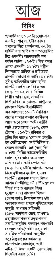 গ্যালারি ৮৮: ১১-৭টা (সোমবার ২-৭টা)। শানু লাহিড়ীর কাজ। গগনেন্দ্র শিল্প প্রদর্শশালা: ২-৮টা। যামিনী রায় স্মৃতি সংসদ আয়োজিত চিত্র প্রদর্শনী। অ্যাকাডেমি অব ফাইন আর্টস: ১২-৮টা। বিভা বসুর একক প্রদর্শনী। ১২-৮টা। পৃথ্বীশ শিকদারের গ্রাফিক্স ও ড্রয়িংয়ের প্রদর্শনী। সাউথ গ্যালারি। ১২-৮টা। সুদীপ্ত অধিকারীর আঁকা ছবির প্রদর্শনী। নর্থ গ্যালারি। ৫-৩০ (অন্য দিন ১২-৮টা)। বিভিন্ন শিল্পীর আঁকা ছবি, ভাস্কর্য ও প্রিন্টমেকিং। আয়োজনে কন্ট্রিভান্স। রামকৃষ্ণ মিশন ইনস্টিটিউট অব কালচার: ১১-৭টা (রবিবার বাদে)। সামার কালার কার্নিভাল। আয়োজনে বেঙ্গল আর্ট ফ্যাক্টরি। আর্ট এক্সপোজ়ার (১৬/২, লেক টেরাস): ১১-৮টা (রবিবার ও ছুটির দিন বাদে)। ‘যোগেন চৌধুরী: ইন সেলিব্রেশন’। আইসিসিআর: বেঙ্গল গ্যালারি। ৬টা (অন্য দিন ৩-৮টা)। বিভিন্ন আলোকচিত্রীর তোলা ছবি। আয়োজনে লেন্স মাস্টার। মায়া আর্ট স্পেস: ৬টা (অন্য দিন ২-৮টা)। আলপনা অঙ্কন নিয়ে সুধীরঞ্জন মুখোপাধ্যায়ের প্রদর্শনী। রামকৃষ্ণ সারদা মিশন আশ্রম (এন্টালি): ৬টা। ‘শ্রীমদ্ভগবত গীতা’ পাঠ ও ব্যাখ্যায় শিখা মুখোপাধ্যায়। রামকৃষ্ণ মিশন (গোলপার্ক): শিবানন্দ হল। ৬টা। ‘ভাগবত কথা’ প্রসঙ্গে নৃসিংহপ্রসাদ ভাদুড়ী। অধ্যয়ন সম্মিলনী (৫৮৬, সার্কুলার রোড, হাওড়া): গ্রন্থাগারের শতবর্ষ উদ্যাপনের সমাপ্তি অনুষ্ঠান। কলাভৃৎ পরশমণি (বন্ডেল রোড): ৭টা। নৃত্যমালা। সামগ্রিক পরিচালনা- অনুশীলা বসু। ঠাকুরপুকুর ক্যানসার হাসপাতাল প্রেক্ষাগৃহ: ৩টে। নাটক ‘চিকিৎসা সঙ্কট’। বেলঘরিয়া থিয়েটার অ্যাকাডেমি।