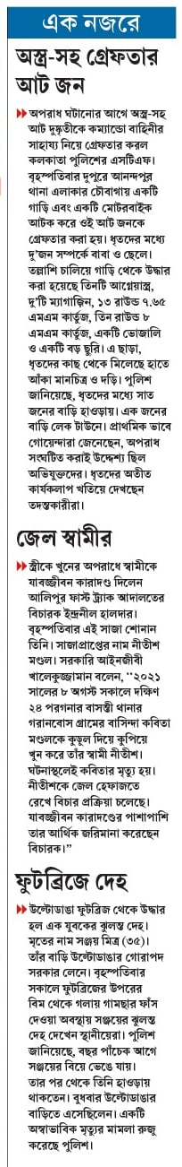 }} অপরাধ ঘটানোর আগে অস্ত্র-সহ আট দুষ্কৃতীকে কম্যান্ডো বাহিনীর সাহায্য নিয়ে গ্রেফতার করল কলকাতা পুলিশের এসটিএফ। বৃহস্পতিবার দুপুরে আনন্দপুর থানা এলাকার চৌবাগায় একটি গাড়ি এবং একটি মোটরবাইক আটক করে ওই আট জনকে গ্রেফতার করা হয়। ধৃতদের মধ্যে দু’জন সম্পর্কে বাবা ও ছেলে। তল্লাশি চালিয়ে গাড়ি থেকে উদ্ধার করা হয়েছে তিনটি আগ্নেয়াস্ত্র, দু’টি ম্যাগাজ়িন, ১৩ রাউন্ড ৭.৬৫ এমএম কার্তুজ, তিন রাউন্ড ৮ এমএম কার্তুজ, একটি ভোজালি ও একটি বড় ছুরি। এ ছাড়া, ধৃতদের কাছ থেকে মিলেছে হাতে আঁকা মানচিত্র ও দড়ি। পুলিশ জানিয়েছে, ধৃতদের মধ্যে সাত জনের বাড়ি হাওড়ায়। এক জনের বাড়ি লেক টাউনে। প্রাথমিক ভাবে গোয়েন্দারা জেনেছেন, অপরাধ সংঘটিত করাই উদ্দেশ্য ছিল অভিযুক্তদের। ধৃতদের অতীত কার্যকলাপ খতিয়ে দেখছেন তদন্তকারীরা।
