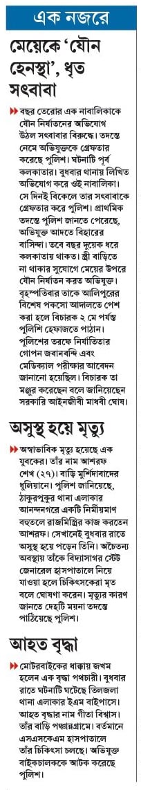 }} বছর তেরোর এক নাবালিকাকে যৌন নির্যাতনের অভিযোগ উঠল সৎবাবার বিরুদ্ধে। তদন্তে নেমে অভিযুক্তকে গ্রেফতার করেছে পুলিশ। ঘটনাটি পূর্ব কলকাতার। বুধবার থানায় লিখিত অভিযোগ করে ওই নাবালিকা। সে দিনই বিকেলে তার সৎবাবাকে গ্রেফতার করে পুলিশ। প্রাথমিক তদন্তে পুলিশ জানতে পেরেছে, অভিযুক্ত আদতে বিহারের বাসিন্দা। তবে বছর দুয়েক ধরে কলকাতায় থাকত। স্ত্রী বাড়িতে না থাকার সুযোগে মেয়ের উপরে যৌন নির্যাতন করত অভিযুক্ত। বৃহস্পতিবার তাকে আলিপুরের বিশেষ পকসো আদালতে পেশ করা হলে বিচারক ২ মে পর্যন্ত পুলিশি হেফাজতে পাঠান। পুলিশের তরফে নির্যাতিতার গোপন জবানবন্দি এবং মেডিক্যাল পরীক্ষার আবেদন জানানো হয়েছিল। বিচারক তা মঞ্জুর করেছেন বলে জানিয়েছেন সরকারি আইনজীবী মাধবী ঘোষ।