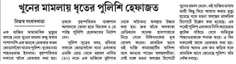 এক ব্যক্তির অস্বাভাবিক মৃত্যুর তদন্তে নেমে খুনের মামলা রুজু করার পাশাপাশি এক জনকে গ্রেফতার করল জোড়াসাঁকো থানার পুলিশ। ধৃতের নাম শাহনওয়াজ ইসলাম। বৃহস্পতিবার সকালে তাঁকে গ্রেফতার করা হয়। ধৃতকে বৃহস্পতিবার ব্যাঙ্কশাল আদালতে তোলা হলে বিচারক ৪ মে পর্যন্ত পুলিশি হেফাজতের নির্দেশ দেন।