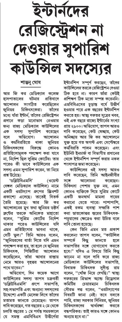 মধ্যে যাঁরা ইন্টার্ন, তাঁদের রেজিস্ট্রেশন প্রদানে কড়া মনোভাব নেওয়ার জন্য রাজ্য মেডিক্যাল কাউন্সিলের এক সদস্য সুপারিশ করেছেন