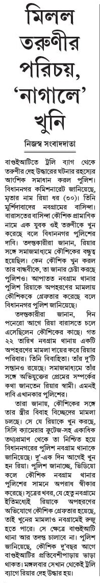 বাগুইআটিতে ট্রলি ব্যাগ থেকে তরুণীর দেহ উদ্ধারের ঘটনার রহস্যের আংশিক সমাধান করল পুলিশ। বিধাননগর কমিশনারেট জানিয়েছে, মৃতার নাম রিয়া ধর (৩০)। তিনি মুর্শিদাবাদের নবগ্রামের বাসিন্দা। বারাসতের বাসিন্দা কৌশিক প্রামাণিক নামে এক যুবক ওই তরুণীকে খুন করেছে বলে বিধাননগর পুলিশের দাবি। তদন্তকারীরা জানান, রিয়ার সঙ্গে সমাজমাধ্যমে কৌশিকের বন্ধুত্ব হয়েছিল। কেন কৌশিক খুন করল তার বান্ধবীকে, তা জানার চেষ্টা করছে পুলিশও। আপাতত নবগ্রাম থানার পুলিশ রিয়াকে অপহরণের মামলায় কৌশিককে গ্রেফতার করেছে বলে বিধাননগর পুলিশ জানিয়েছে।