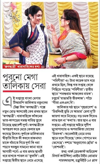 এই সপ্তাহে বাংলা মেগার টিআরপি তালিকায় নতুনদের টেক্কা দিল ‘জগদ্ধাত্রী’। গল্পে নতুন মোড় আসতেই ফের প্রথম স্থানে ‘জগদ্ধাত্রী’। ধারাবাহিকে কাঁকনের ভাত-কাপড়ের সমস্ত দায়িত্ব তুলে নিয়েছে ছদ্মবেশী দুর্গা। জগদ্ধাত্রীকে অপহরণ করে মেরে ফেলার ছক কষেছে উৎসব। দুর্গাকে মালিকানার স্বীকৃতি দিতে কী করবে রাজনাথ? মাকে বাঁচাতে গিয়ে দুর্গা কি ধরা পড়বে স্বয়ম্ভুর সামনে? জানা যাবে আগামী পর্বে। এ বার প্রথম স্থানটি ধরে রাখতে পারল না ‘ফুলকি’। এই সপ্তাহে দ্বিতীয় স্থানে নেমে এসেছে এই ধারাবাহিক। একই স্থানে রয়েছে ‘পরিণীতা’-ও। টানা কয়েক মাস ধরে প্রথমে ছিল, কিন্তু গত সপ্তাহ থেকে পিছিয়ে পড়েছে ‘পরিণীতা’। তৃতীয় স্থানে ‘পরশুরাম আজকের নায়ক’। চতুর্থে ‘রাঙামতি তীরন্দাজ’। পাঁচে ‘গীতা এলএল.বি’।