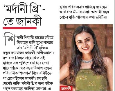 শিবানী শিবাজি রায়ের চরিত্রে ফিরছেন রানি মুখোপাধ্যায়। তাঁর ‘মর্দানী থ্রি’ ছবিতে নতুন সংযোজন জানকী বোদীওয়ালা। যশ রাজ ফিল্মস প্রযোজিত এই ছবিতে এক পুলিশের চরিত্রে দেখা যাবে তাঁকে। গত বছর বিকাশ বহেল পরিচালিত ‘শয়তান’ দিয়ে বলিউডে পা রেখেছিলেন জানকী। সে ছবি দেখেই নাকি ‘মর্দানী থ্রি’র জন্য তাঁকে পছন্দ করেছেন আদিত্য চোপড়া। এ ছবির পরিচালনার দায়িত্বে রয়েছেন অভিরাজ মীনাওয়ালা। আগামী বছর দোলে মুক্তি পাওয়ার কথা ছবিটির।