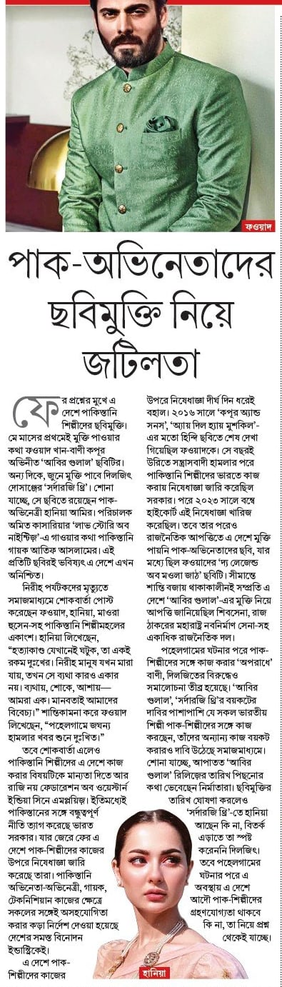 এ দেশে পাক-শিল্পীদের কাজের উপরে নিষেধাজ্ঞা দীর্ঘ দিন ধরেই বহাল। ২০১৬ সালে ‘কপূর অ্যান্ড সনস’, ‘অ্যায় দিল হ্যায় মুশকিল’-এর মতো হিন্দি ছবিতে শেষ দেখা গিয়েছিল ফওয়াদকে। সে বছরই উরিতে সন্ত্রাসবাদী হামলার পরে পাকিস্তানি শিল্পীদের ভারতে কাজ করায় নিষেধাজ্ঞা জারি করেছিল সরকার। পরে ২০২৩ সালে বম্বে হাইকোর্ট এই নিষেধাজ্ঞা খারিজ করেছিল। তবে তার পরেও রাজনৈতিক আপত্তিতে এ দেশে মুক্তি পায়নি পাক-অভিনেতাদের ছবি, যার মধ্যে ছিল ফওয়াদের ‘দ্য লেজেন্ড অব মওলা জাঠ’ ছবিটি। সীমান্তে শান্তি বজায় থাকাকালীনই সম্প্রতি এ দেশে ‘আবির গুলাল’-এর মুক্তি নিয়ে আপত্তি জানিয়েছিল শিবসেনা, রাজ ঠাকরের মহারাষ্ট্র নবনির্মাণ সেনা-সহ একাধিক রাজনৈতিক দল।