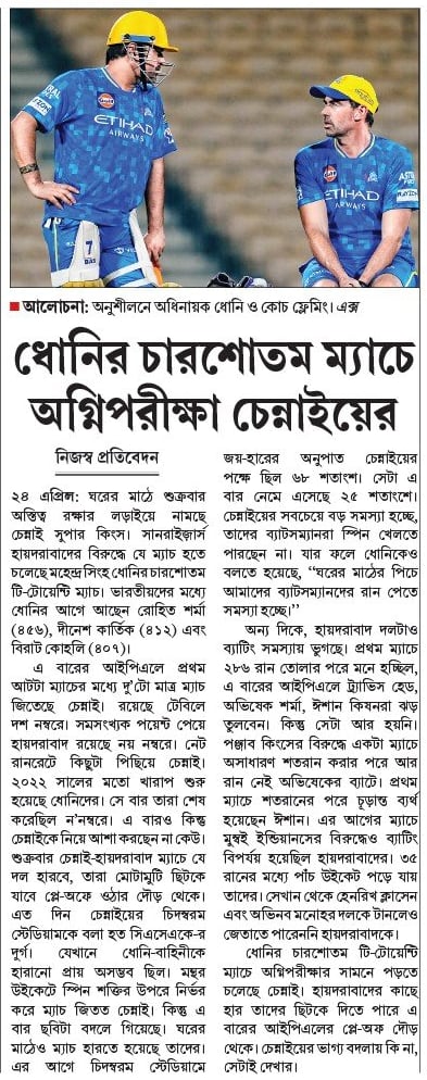 ২৪ এপ্রিল: ঘরের মাঠে শুক্রবার অস্তিত্ব রক্ষার লড়াইয়ে নামছে চেন্নাই সুপার কিংস। সানরাইজ়ার্স হায়দরাবাদের বিরুদ্ধে যে ম্যাচ হতে চলেছে মহেন্দ্র সিংহ ধোনির চারশোতম টি-টোয়েন্টি ম্যাচ। ভারতীয়দের মধ্যে ধোনির আগে আছেন রোহিত শর্মা (৪৫৬), দীনেশ কার্তিক (৪১২) এবং বিরাট কোহলি (৪০৭)।
