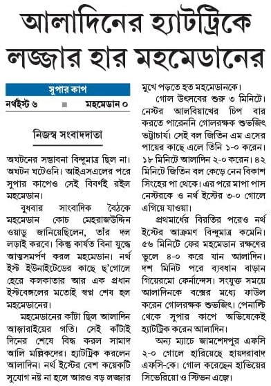 মহমেডানের কাঁটা ছিল আলাদিন আজ়ারাইয়ের গতি। সেই কাঁটাই দিনের শেষে বিদ্ধ করল সামাদ আলি মল্লিকদের। হ্যাটট্রিক করলেন আলাদিন। নর্থ ইস্টের বেশ কয়েকটি সুযোগ নষ্ট না হলে আরও বড় লজ্জার মুখে পড়তে হত মহমেডানকে।