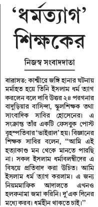 বারাসত: কাশ্মীরে জঙ্গি হানার ঘটনায় মর্মাহত হয়ে তিনি ইসলাম ধর্ম ত্যাগ করলেন বলে দাবি উত্তর ২৪ পরগনার বাদুড়িয়ার বাসিন্দা, স্কুলশিক্ষক তথা সাংবাদিক সাবির হোসেনের। এ সংক্রান্ত তাঁর একটি ফেসবুক পোস্ট বৃহস্পতিবার ‘ভাইরাল’ হয়। বিজ্ঞানের শিক্ষক সাবির বলেন, ‘‘আমি এই হত্যাকাণ্ড মন থেকে মানতে পারছি না। সকল ইসলাম ধর্মাবলম্বীদের এ বিষয়ে প্রতিবাদ করা উচিত। আমি ইসলাম ধর্ম ত্যাগ করলাম। এ জন্য নিয়মমাফিক আদালতে এখনও হলফনামা জমা করিনি। দু’এক দিনের মধ্যে করব। ধর্মহীন থাকতে চাই।’’