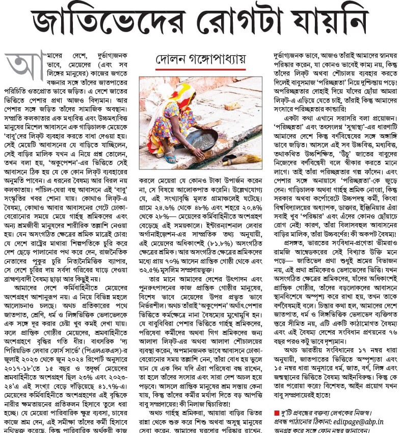 তার মানে আমাদের দেশের উৎপাদন এবং পুনরুৎপাদনের কাজ প্রান্তিক গোষ্ঠীর মানুষের, বিশেষ ভাবে মেয়েদের উপর প্রভূত ভাবে নির্ভরশীল। অথচ তাঁরাই ‘অকুপেশন’ অর্থাৎ পেশার ভিত্তিতে কর্মক্ষেত্রে নানা বৈষম্যের মুখোমুখি হন। যে বাবুবিবিরা পেশার ভিত্তিতে গার্হস্থ শ্রমিকদের, পরিষেবা কর্মীদের অথবা গিগ শ্রমিকদের জন্য আলাদা লিফ্ট-এর অথবা আলাদা শৌচালয়ের ব্যবস্থা করেন, অপমানজনক ভাবে আবাসনে ঢোকা-বেরোনোর সময় তল্লাশি নেন, তাঁরা বোধ হয় ভুলে যান যে এক দিন যদি এঁরা পরিষেবা বন্ধ রাখেন, তা হলে তাঁদের সংসার এবং সারা দেশ অচল হয়ে পড়বে। আসলে প্রান্তিক মানুষের শ্রম সস্তায় কেনা যায়, কিন্তু তাঁদের কর্মীর মর্যাদা দিতে বড় আপত্তি বাবু সম্প্রদায়ের! কী নিলাজ দ্বিচারিতা!