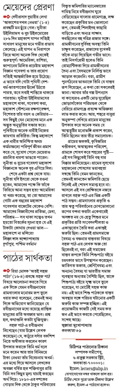 রিয়া মোদক ‘অতই সহজ পাঠ?’ (১৬-৪) প্রবন্ধে সহজ পাঠ বিষয়ে আলোচনা করতে গিয়ে এক দিকে যেমন রবীন্দ্রনাথের গ্রামবাংলার মনোরম রূপ তুলে ধরার কথা বলেছেন, তেমনই অন্য দিকে অভিযোগ জানিয়েছেন যে রবীন্দ্রনাথের মধ্যে রয়েছে প্রান্তিক মানুষের প্রতি অবজ্ঞার ভাব। প্রশ্ন হল, কথাগুলি কতটা যুক্তিযুক্ত।