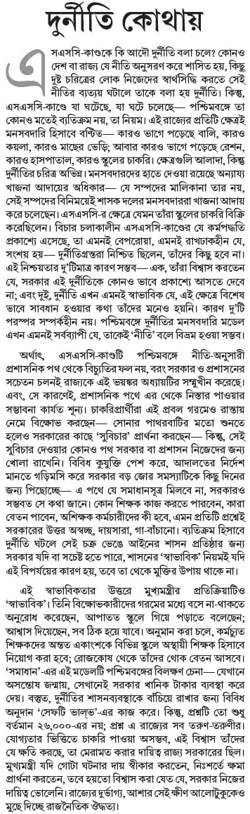 অর্থাৎ, এসএসসি-কাণ্ডটি পশ্চিমবঙ্গে নীতি-অনুসারী প্রশাসনিক পথ থেকে বিচ্যুতির ফল নয়, বরং সরকার ও প্রশাসনের সচেতন চলনই রাজ্যকে এই ভয়ঙ্কর অধ্যায়টির সম্মুখীন করেছে। এবং, সে কারণেই, প্রশাসনিক পথে এর থেকে নিস্তার পাওয়ার সম্ভাবনা কার্যত শূন্য। চাকরিপ্রার্থীরা এই প্রবল গরমেও রাস্তায় নেমে বিক্ষোভ করছেন— সোনার পাথরবাটির মতো শুনতে হলেও সরকারের কাছে ‘সুবিচার’ প্রার্থনা করছেন— কিন্তু, সেই সুবিচার দেওয়ার কোনও পথ সরকার বা প্রশাসন নিজেদের জন্য খোলা রাখেনি। বিবিধ কুযুক্তি পেশ করে, আদালতের নির্দেশ মানতে গড়িমসি করে সরকার বড় জোর সমস্যাটিকে কিছু দিনের জন্য পিছোচ্ছে— এ পথে যে সমাধানসূত্র মিলবে না, সরকারও সম্ভবত সে কথা জানে। কোন শিক্ষক কাজ করতে পারবেন, কারা বেতন পাবেন, অশিক্ষক কর্মচারীদের কী হবে, এমন প্রতিটি প্রশ্নেই সরকারের উত্তর অস্বচ্ছ, দায়সারা, গা-বাঁচানো। ব্যতিক্রম হিসাবে দুর্নীতি ঘটলে সেই চক্র ভেঙে আইনের শাসন প্রতিষ্ঠার জন্য সরকার যদি বা সচেষ্ট হতে পারে, শাসনের ‘স্বাভাবিক’ নিয়মই যদি এই বিপর্যয়ের কারণ হয়, তবে তা থেকে মুক্তির উপায় থাকে না।