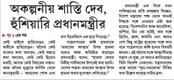 কেউ ভাইকে হারিয়েছেন, কেউ স্বামীকে হারিয়েছেন। তাঁদের কেউ বাংলায় কথা বলতেন, কেউ কন্নড়ে কথা বলতেন, কেউ কেউ ছিলেন মরাঠি, আবার কেউ বিহারের সন্তান। আজ তাঁদের মৃত্যুতে কার্গিল থেকে কন্যাকুমারী— আমাদের শোক এবং রাগ মিলেমিশে এক হয়ে গিয়েছে।”