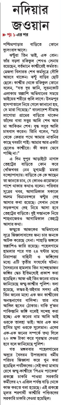 ঝন্টুরা তিন ভাই, এক বোন। তাঁর বড়দা রফিকুল শেখও সেনায় রয়েছেন, বর্তমানে কাশ্মীরেই কর্মরত। মেজদা বিসারত শেখ কর্মসূত্রে সৌদি আরবে থাকেন। ঝন্টু বাড়ির ছোট ছেলে। কাশ্মীর থেকে রফিকুল ফোনে বলেন, “যত দূর জানি, সুরনকোট এলাকায় তল্লাশি অভিযানের সময়ে ভাইয়ের শরীরে গুলি লাগে। উধমপুর হাসপাতালে নিয়ে গেলে জানানো হয়, সে মারা গিয়েছে।” বাংলাদেশ সীমান্ত লাগোয়া গ্রামের বাড়িতে থাকেন তাঁদের বাবা সবুর আলি শেখ আর মা আকিরন শেখ। বৃদ্ধ সবুর আলি চাষবাস করেন। তিনি বলেন, “মাঠ থেকে ফেরার পথে আমার নাতনির কাছে খবরটা পাই। আমার আর একটা ছেলেও কাশ্মীরে। কী করব ভেবে পাচ্ছি না।”