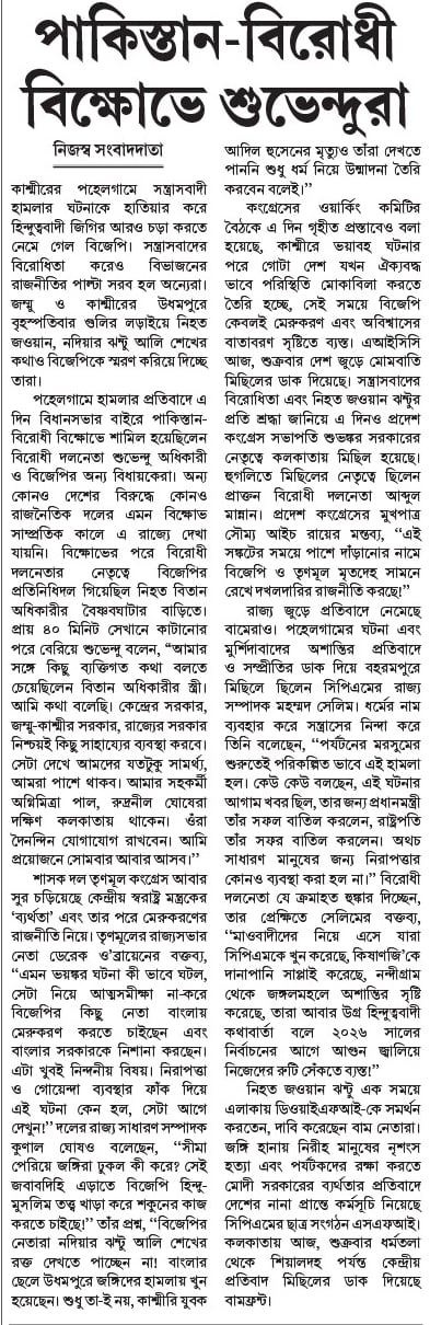 পহেলগামে হামলার প্রতিবাদে এ দিন বিধানসভার বাইরে পাকিস্তান-বিরোধী বিক্ষোভে শামিল হয়েছিলেন বিরোধী দলনেতা শুভেন্দু অধিকারী ও বিজেপির অন্য বিধায়কেরা। অন্য কোনও দেশের বিরুদ্ধে কোনও রাজনৈতিক দলের এমন বিক্ষোভ সাম্প্রতিক কালে এ রাজ্যে দেখা যায়নি। বিক্ষোভের পরে বিরোধী দলনেতার নেতৃত্বে বিজেপির প্রতিনিধিদল গিয়েছিল নিহত বিতান অধিকারীর বৈষ্ণবঘাটার বাড়িতে। প্রায় ৪০ মিনিট সেখানে কাটানোর পরে বেরিয়ে শুভেন্দু বলেন, “আমার সঙ্গে কিছু ব্যক্তিগত কথা বলতে চেয়েছিলেন বিতান অধিকারীর স্ত্রী। আমি কথা বলেছি। কেন্দ্রের সরকার, জম্মু-কাশ্মীর সরকার, রাজ্যের সরকার নিশ্চয়ই কিছু সাহায্যের ব্যবস্থা করবে। সেটা দেখে আমদের যতটুকু সামর্থ্য, আমরা পাশে থাকব। আমার সহকর্মী অগ্নিমিত্রা পাল, রুদ্রনীল ঘোষেরা দক্ষিণ কলকাতায় থাকেন। ওঁরা দৈনন্দিন যোগাযোগ রাখবেন। আমি প্রয়োজনে সোমবার আবার আসব।’’