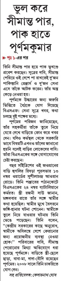 পূর্ণমের পরিজন জানিয়েছেন, তাঁর সহকর্মীরা তাঁকে তুলে নিয়ে যেতে দেখে বাড়িতে ফোন করে খবর দেন। যদিও কর্মস্থল থেকে সরকারি ভাবে বিষয়টি এখনও তাঁদের জানানো হয়নি বলেই বাড়ির লোকেদের দাবি। তাঁরা বিএসএফের সঙ্গে যোগাযোগের চেষ্টা করছেন।