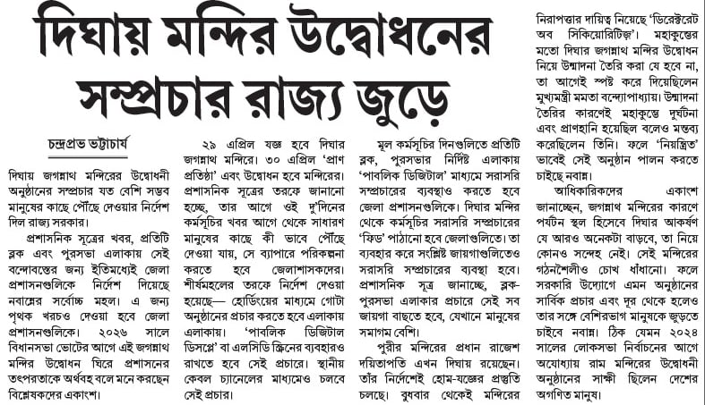 ২৯ এপ্রিল যজ্ঞ হবে দিঘার জগন্নাথ মন্দিরে। ৩০ এপ্রিল ‘প্রাণ প্রতিষ্ঠা’ এবং উদ্বোধন হবে মন্দিরের। প্রশাসনিক সূত্রের তরফে জানানো হচ্ছে, তার আগে ওই দু’দিনের কর্মসূচির খবর আগে থেকে সাধারণ মানুষের কাছে কী ভাবে পৌঁছে দেওয়া যায়, সে ব্যাপারে পরিকল্পনা করতে হবে জেলাশাসকদের। শীর্ষমহলের তরফে নির্দেশ দেওয়া হয়েছে— হোর্ডিংয়ের মাধ্যমে গোটা অনুষ্ঠানের প্রচার করতে হবে এলাকায় এলাকায়। ‘পাবলিক ডিজিটাল ডিসপ্লে’ বা এলসিডি স্ক্রিনের ব্যবহারও রাখতে হবে সেই প্রচারে। স্থানীয় কেবল চ্যানেলের মাধ্যমেও চলবে