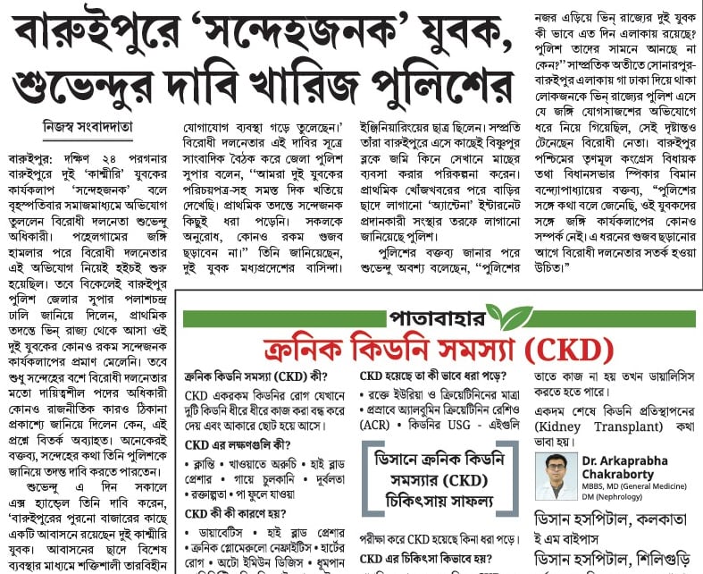 শুভেন্দু এ দিন সকালে এক্স হ্যান্ড্লে তিনি দাবি করেন, ‘বারুইপুরের পুরনো বাজারের কাছে একটি আবাসনে রয়েছেন দুই কাশ্মীরি যুবক। আবাসনের ছাদে বিশেষ ব্যবস্থার মাধ্যমে শক্তিশালী তারবিহীন যোগাযোগ ব্যবস্থা গড়ে তুলেছেন।’ বিরোধী দলনেতার এই দাবির সূত্রে সাংবাদিক বৈঠক করে জেলা পুলিশ সুপার বলেন, ‘‘আমরা দুই যুবকের পরিচয়পত্র-সহ সমস্ত দিক খতিয়ে দেখেছি। প্রাথমিক তদন্তে সন্দেজনক কিছুই ধরা পড়েনি। সকলকে অনুরোধ, কোনও রকম গুজব ছড়াবেন না।’’ তিনি জানিয়েছেন, দুই যুবক মধ্যপ্রদেশের বাসিন্দা। ইঞ্জিনিয়ারিংয়ের ছাত্র ছিলেন। সম্প্রতি তাঁরা বারুইপুরে এসে কাছেই বিষ্ণুপুর ব্লকে জমি কিনে সেখানে মাছের ব্যবসা করার পরিকল্পনা করেন। প্রাথমিক খোঁজখবরের পরে বাড়ির ছাদে লাগানো ‘অ্যান্টেনা’ ইন্টারনেট প্রদানকারী সংস্থার তরফে লাগানো জানিয়েছে পুলিশ।