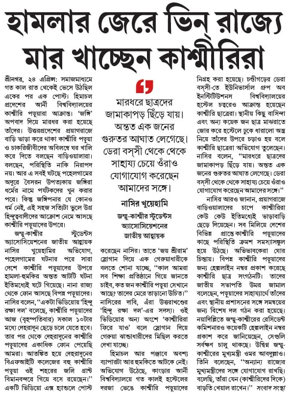 নাসির আরও জানান, প্রয়াগরাজে বাড়িওয়ালাদের চাপে কাশ্মীরিরা কেউ কেউ ইতিমধ্যেই ভাড়াবাড়ি ছেড়ে দিয়েছেন। সব মিলিয়ে দেশের বিভিন্ন প্রান্তে কাশ্মীরি পড়ুয়াদের কাছে পরিস্থিতি ক্রমশ সমস্যাসঙ্কুল হয়ে উঠছে। অভিভাবকেরা ঘোর চিন্তায়। বিপন্ন কাশ্মীরি পড়ুয়াদের জন্য হেল্পলাইন নম্বর প্রকাশ করেছে কাশ্মীরি ছাত্র সংগঠনটি। তাদের জাতীয় সভাপতি উমর জামাল বলেছেন, পড়ুয়াদের সাহায্যার্থে তাঁদের এবং স্থানীয় প্রশাসনের সঙ্গে সমন্বয়ের জন্য বিশেষ দল গঠন করা হয়েছে। নয়াদিল্লিতে জম্মু-কাশ্মীরের রেসিডেন্ট কমিশনারও কয়েকটি হেল্পলাইন নম্বর প্রকাশ করে জানিয়েছেন, সেগুলি সর্বক্ষণ চালু থাকছে। উদ্বিগ্ন জম্মু-কাশ্মীরের মুখ্যমন্ত্রী ওমর আবদুল্লাও। তিনি বলেছেন, ‘‘অন্যান্য রাজ্যের মুখ্যমন্ত্রীদের সঙ্গে যোগাযোগ রাখছি। বলেছি, তাঁরা যেন (কাশ্মীরিদের দিকে) বাড়তি খেয়াল রাখেন।’’ সংবাদ সংস্থা
