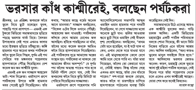 এমনই এক জন সাজ্জাদ আহমেদ ভাট। শাল বিক্রেতা। ওয়টস্যাপ গ্রুপে পর্যটকদের উপরে জঙ্গি হামলার খবর পেয়েই ছুটে গিয়েছিলেন। তাঁর কথায়, “আমার কাছে ধর্মের অনেক আগে মানবতা।” সাজ্জাদ বলছিলেন, “বিকেল ৩টের দিকে ওখানে পৌঁছই। আহতদের জল খাওয়াই। পর্যটকদের কাঁদতে দেখে আমার চোখেও জল আসছিল। হাঁটতে পারছিলেন না যাঁরা, তাঁদের মধ্যে কয়েক জনকে আমিও কাঁধে নিয়ে হাসপাতালে গিয়েছিলাম। এই পর্যটকদের সূত্রে আমাদের অন্নের সংস্থান হয়। পর্যটকেরা না থাকলে তো আমাদের জীবন অসম্পূর্ণ।” যে দুর্গম পথ তাঁদের অভ্যস্ত পায়েও পার হতে মিনিট পঁচিশ লেগে যায়, সেই দিন জখমদের কাঁধে নিয়ে কুড়ি মিনিটে তা পেরিয়ে গিয়েছিলেন সাজ্জাদরা।