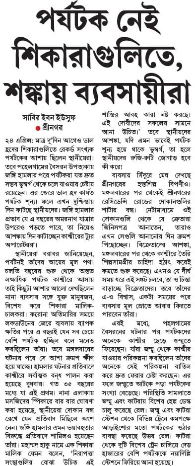 স্থানীয়েরা বরাবর জানিয়েছেন, পর্যটনই তাঁদের আয়ের মূল পথ। চলতি বছরের শুরু থেকে অন্তত লক্ষাধিক পর্যটক কাশ্মীরে আসায় তাই কিছুটা আশার আলো দেখছিলেন নানা ব্যবসার সঙ্গে যুক্ত মানুষজন, বিশেষ করে শিকারা মালিক-চালকরা। করোনা অতিমারির সময়ে লকডাউনের জেরে ব্যবসায় ব্যাপক ক্ষতির পরে এ বছরই যেন সব চেয়ে বেশি পর্যটক হচ্ছিল বলে মনেও করছিলেন তাঁরা। তবে মঙ্গলবারের ঘটনার পরে সে আশা ক্রমশ ক্ষীণ হয়ে যাচ্ছে। হামলার ঘটনার প্রতিবাদে কাশ্মীরে সর্বাত্মক বন্ধ পালন করা হয়েছে বুধবার। গত ৩৫ বছরের মধ্যে যা এই প্রথম। নানা এলাকায় মসজিদের স্পিকারে বার বার ঘোষণা করা হয়েছে, স্থানীয়েরা দোকান বন্ধ রেখে যেন প্রতিবাদ মিছিলে অংশ নেন। জঙ্গি হামলার এমন ভয়াবহতার বিরুদ্ধে প্রতিবাদে শামিলও হয়েছেন তাঁরা। মহাম্মদ হাকু নামে এক শিকারা মালিক যেমন বলেন, ‘নিরাপত্তা সংস্থাগুলির বোঝা উচিত এই