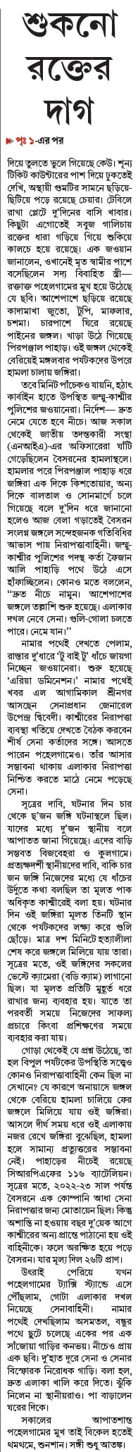 দিয়ে তুলতে ভুলে গিয়েছে কেউ। শূন্য টিকিট কাউন্টারের পাশ দিয়ে ঢুকতেই দেখি, অস্থায়ী গুমটির সামনে ছড়িয়ে-ছিটিয়ে পড়ে রয়েছে চেয়ার। টেবিলে রাখা প্লেটে দু’দিনের বাসি খাবার। কিছুটা এগোতেই সবুজ গালিচায় রক্তের ধারা গড়িয়ে গিয়ে শুকিয়ে কালচে হয়ে রয়েছে। এক জওয়ান জানালেন, ওখানেই মৃত স্বামীর পাশে বসেছিলেন সদ্য বিবাহিত স্ত্রী— রক্তাক্ত পহেলগামের মুখ হয়ে উঠেছে যে ছবি। আশেপাশে ছড়িয়ে রয়েছে কাদামাখা জুতো, টুপি, মাফলার, চশমা। চারপাশে ঘিরে রয়েছে পাইনের জঙ্গল। খাড়া উঠে গিয়েছে পিরপঞ্জাল পাহাড়। ওই জঙ্গল থেকেই বেরিয়েই মঙ্গলবার পর্যটকদের উপরে হামলা চালায় জঙ্গিরা।