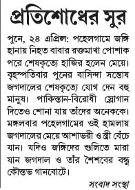 পুনে, ২৪ এপ্রিল: পহেলগামে জঙ্গি হানায় নিহত বাবার রক্তমাখা পোশাক পরে শেষকৃত্যে হাজির হলেন মেয়ে। বৃহস্পতিবার পুনের বাসিন্দা সন্তোষ জগদালের শেষকৃত্যে যোগ দেন বহু মানুষ। পাকিস্তান-বিরোধী স্লোগান দিতেও শোনা যায় তাঁদের অনেককে। মঙ্গলবার পহেলগামের ওই হামলায় জগদালের মেয়ে আশাভরী ও স্ত্রী বেঁচে যান। যদিও জঙ্গিদের গুলিতে মারা যান জগদাল ও তাঁর শৈশবের বন্ধু কৌস্তভ গানবোটে।