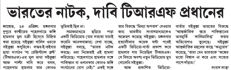 করেনি আনন্দবাজার) দেখা যাচ্ছে, সইফুল্লা বলছে, “ভারত নাটক করছে। ওরা নিজেরাই এই হামলা করিয়েছে। পহেলগামে হামলার সঙ্গে