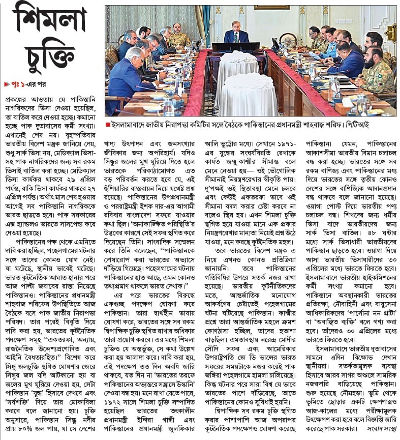 এর পরে ভারতের বিরুদ্ধে একগুচ্ছ পদক্ষেপ ঘোষণা করে পাকিস্তান। তারা দ্ব্যর্থহীন ভাষায় ঘোষণা করে, ভারতের সঙ্গে সব রকম দ্বিপাক্ষিক চুক্তি স্থগিত রাখার অধিকার তারা প্রয়োগ করবে। এর মধ্যে শিমলা চুক্তিও যে অন্তর্ভুক্ত, সে কথা উল্লেখ করা হয় আলাদা করে। দাবি করা হয়, এই পদক্ষেপ তত দিন অবধি জারি থাকবে, যত দিন না ‘ভারতের তরফে পাকিস্তানের অভ্যন্তরে সন্ত্রাসে উস্কানি’ দেওয়া বন্ধ হয়। মনে রাখা যেতে পারে, ১৯৭২ সালে শিমলা চুক্তি সম্পাদিত হয়েছিল ভারতের তৎকালীন প্রধানমন্ত্রী ইন্দিরা গান্ধী এবং পাকিস্তানের প্রধানমন্ত্রী জুলফিকার আলি ভুট্টোর মধ্যে। সেখানে ১৯৭১-এর যুদ্ধের সংঘর্ষবিরতি রেখাকে কার্যত জম্মু-কাশ্মীর সীমান্ত বলে মেনে নেওয়া হয়— ওই ভৌগোলিক সীমানাই নিয়ন্ত্রণরেখার স্বীকৃতি পায়। দু’পক্ষই ওই স্থিতাবস্থা মেনে চলবে এবং কেউই একতরফা ভাবে ওই সীমানা বদল করার চেষ্টা করবে না বলেও স্থির হয়। এখন শিমলা চুক্তি স্থগিত হয়ে যাওয়া মানে এক প্রকার নিয়ন্ত্রণরেখার মান্যতা নিয়েই প্রশ্ন উঠে যাওয়া, মনে করছে কূটনৈতিক মহল।