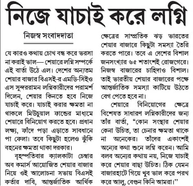 শেয়ারে বিনিয়োগের ক্ষেত্রে বিশেষত সাধারণ লগ্নিকারীদের জন্য তাঁর বার্তা, “কোন সংস্থার শেয়ার কেনা উচিত, তা চেনার ক্ষমতা থাকে না অনেকের। তাঁদের একাংশই অন্যের কথা শুনে লগ্নি করেন। আমি বলব অন্যের কথায় নয়, নিজে যাচাই করে শেয়ার বাছা উচিত। ঠিক যেমন বাজারহাটে গিয়ে খুব ভাল করে পরখ করে আলু, বেগুন কিনি আমরা।’’