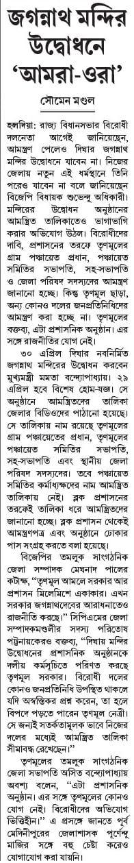 ৩০ এপ্রিল দিঘার নবনির্মিত জগন্নাথ মন্দিরের উদ্বোধন করবেন মুখ্যমন্ত্রী মমতা বন্দ্যোপাধ্যায়। ২৯ এপ্রিল হবে বিশেষ হোম-যজ্ঞ। সে অনুষ্ঠানে আমন্ত্রিতদের তালিকা জেলার বিডিওদের পাঠানো হয়েছে। সে তালিকায় নাম রয়েছে তৃণমূলের গ্রাম পঞ্চায়েতের প্রধান, তৃণমূলের পঞ্চায়েত সমিতির সভাপতি, সহ-সভাপতি এবং স্থানীয় জেলা পরিষদ সদস্যদের। তবে পঞ্চায়েত সমিতির কর্মাধ্যক্ষদের নাম আমন্ত্রিত তালিকায় নেই। ব্লক প্রশাসনের তরফেই তালিকা ধরে আমন্ত্রিতদের জানানো হচ্ছে। ব্লক প্রশাসন থেকেই আমন্ত্রণপত্র এবং অনুষ্ঠানে ঢোকার পাস সংগ্রহ করতে বলা হয়েছে।