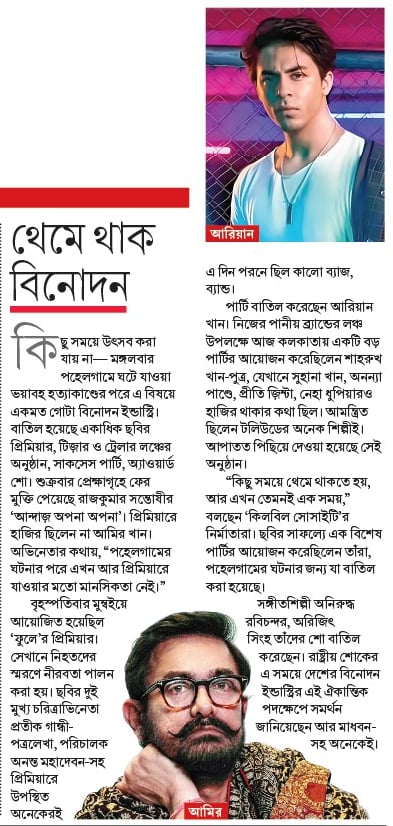 কিছু সময়ে উৎসব করা যায় না— মঙ্গলবার পহেলগামে ঘটে যাওয়া ভয়াবহ হত্যাকাণ্ডের পরে এ বিষয়ে একমত গোটা বিনোদন ইন্ডাস্ট্রি। বাতিল হয়েছে একাধিক ছবির প্রিমিয়ার, টিজ়ার ও ট্রেলার লঞ্চের অনুষ্ঠান, সাকসেস পার্টি, অ্যাওয়ার্ড শো। শুক্রবার প্রেক্ষাগৃহে ফের মুক্তি পেয়েছে রাজকুমার সন্তোষীর ‘আন্দাজ় অপনা অপনা’। প্রিমিয়ারে হাজির ছিলেন না আমির খান। অভিনেতার কথায়, “পহেলগামের ঘটনার পরে এখন আর প্রিমিয়ারে যাওয়ার মতো মানসিকতা নেই।”