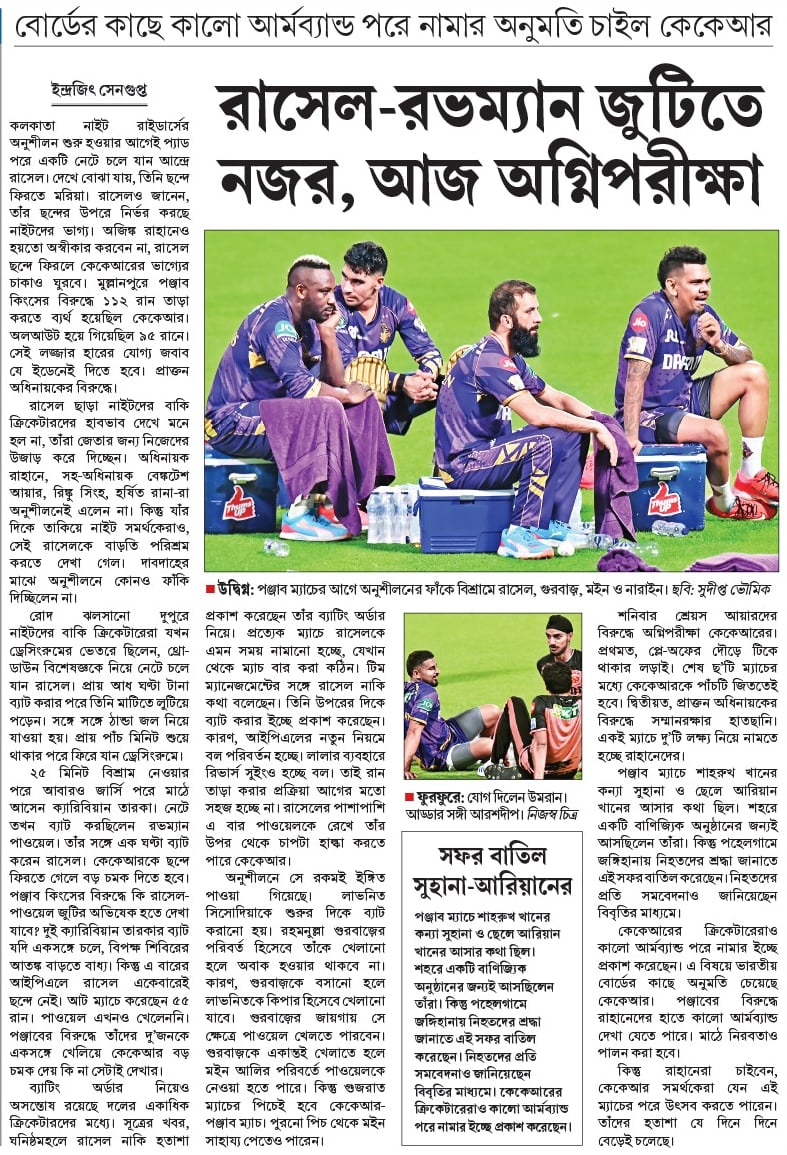 রাসেল ছাড়া নাইটদের বাকি ক্রিকেটারদের হাবভাব দেখে মনে হল না, তাঁরা জেতার জন্য নিজেদের উজাড় করে দিচ্ছেন। অধিনায়ক রাহানে, সহ-অধিনায়ক বেঙ্কটেশ আয়ার, রিঙ্কু সিংহ, হর্ষিত রানা-রা অনুশীলনেই এলেন না। কিন্তু যাঁর দিকে তাকিয়ে নাইট সমর্থকেরাও, সেই রাসেলকে বাড়তি পরিশ্রম করতে দেখা গেল। দাবদাহের মাঝে অনুশীলনে কোনও ফাঁকি