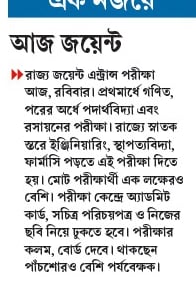 }} রাজ্য জয়েন্ট এন্ট্রান্স পরীক্ষা আজ, রবিবার। প্রথমার্ধে গণিত, পরের অর্ধে পদার্থবিদ্যা এবং রসায়নের পরীক্ষা। রাজ্যে স্নাতক স্তরে ইঞ্জিনিয়ারিং, স্থাপত্যবিদ্যা, ফার্মাসি পড়তে এই পরীক্ষা দিতে হয়। মোট পরীক্ষার্থী এক লক্ষেরও বেশি। পরীক্ষা কেন্দ্রে অ্যাডমিট কার্ড, সচিত্র পরিচয়পত্র ও নিজের ছবি নিয়ে ঢুকতে হবে। পরীক্ষার কলম, বোর্ড দেবে। থাকছেন পাঁচশোরও বেশি পর্যবেক্ষক।