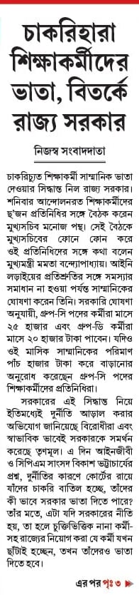 চাকরিচ্যুত শিক্ষাকর্মী সাম্মানিক ভাতা দেওয়ার সিদ্ধান্ত নিল রাজ্য সরকার। শনিবার আন্দোলনরত শিক্ষাকর্মীদের ছ’জন প্রতিনিধির সঙ্গে বৈঠক করেন মুখ্যসচিব মনোজ পন্থ। সেই বৈঠকে মুখ্যসচিবের ফোনে ফোন করে ওই প্রতিনিধিদের সঙ্গে কথা বলেন মুখ্যমন্ত্রী মমতা বন্দ্যোপাধ্যায়। আইনি লড়াইয়ের প্রতিশ্রুতির সঙ্গে সমস্যার সমাধান না হওয়া পর্যন্ত সাম্মানিকের ঘোষণা করেন তিনি। সরকারি ঘোষণা অনুযায়ী, গ্রুপ-সি পদের কর্মীরা মাসে ২৫ হাজার এবং গ্রুপ-ডি কর্মীরা মাসে ২০ হাজার টাকা পাবেন। যদিও ওই মাসিক সাম্মানিকের পরিমাণ পাঁচ হাজার টাকা করে বাড়ানোর অনুরোধ করেছেন গ্রুপ-সি পদের শিক্ষাকর্মীদের প্রতিনিধিরা।