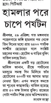 শ্রীনগর, ২৬ এপ্রিল: গত মঙ্গলবার পহেলগামে জঙ্গি হামলার পর থেকে তিন দিনের মধ্যে প্রায় ৩৫০০ পর্যটক কাশ্মীর ছেড়েছেন বলে সংশ্লিষ্ট মহলের খবর। হোটেল ও গাড়ির বুকিং বাতিল চলছে টানা।
