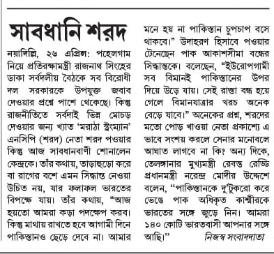 নয়াদিল্লি, ২৬ এপ্রিল: পহেলগাম নিয়ে প্রতিরক্ষামন্ত্রী রাজনাথ সিংহের ডাকা সর্বদলীয় বৈঠকে সব বিরোধী দল সরকারকে উপযুক্ত জবাব দেওয়ার প্রশ্নে পাশে থেকেছে। কিন্তু রাজনীতিতে সর্বদাই ভিন্ন মোচড় দেওয়ার জন্য খ্যাত ‘মরাঠা স্ট্রংম্যান’ এনসিপি (শরদ) নেতা শরদ পওয়ার কিন্তু আজ সাবধানবাণী শোনালেন কেন্দ্রকে। তাঁর কথায়, তাড়াহুড়ো করে বা রাগের বশে এমন সিদ্ধান্ত নেওয়া উচিত নয়, যার ফলাফল ভারতের বিপক্ষে যায়। তাঁর কথায়, “আজ হয়তো আমরা কড়া পদক্ষেপ করব। কিন্তু মাথায় রাখতে হবে আগামী দিনে পাকিস্তানও ছেড়ে দেবে না। আমার মনে হয় না পাকিস্তান চুপচাপ বসে থাকবে।” উদাহরণ হিসাবে পওয়ার টেনেছেন পাক আকাশসীমা বন্ধের সিদ্ধান্তকে। বলেছেন, “ইউরোপগামী সব বিমানই পাকিস্তানের উপর দিয়ে উড়ে যায়। সেই রাস্তা বন্ধ হয়ে গেলে বিমানযাত্রার খরচ অনেক বেড়ে যাবে।” অনেকের প্রশ্ন, শরদের মতো পোড় খাওয়া নেতা প্রকাশ্যে এ ভাবে সংশয় করলে সেনার মনোবলে আঘাত লাগবে না কি? অন্য দিকে, তেলঙ্গানার মুখ্যমন্ত্রী রেবন্ত রেড্ডি প্রধানমন্ত্রী নরেন্দ্র মোদীর উদ্দেশে বলেন, ‘‘পাকিস্তানকে দু’টুকরো করে ভেঙে পাক অধিকৃত কাশ্মীরকে ভারতের সঙ্গে জুড়ে নিন। আমরা ১৪০ কোটি ভারতবাসী আপনার সঙ্গে আছি।’’ নিজস্ব সংবাদদাতা