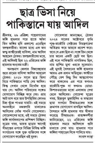 অনন্তনাগ জেলার বিজবেহারার গুরে গ্রামের বাসিন্দা আদিল আহমেদ ঠোকর। ২০১৮ সালে ছাত্র ভিসা নিয়ে পাকিস্তানে পাড়ি দেয় আদিল। কিন্তু সেখান থেকে নিখোঁজ হয়ে যায় সে। আদিল পরিবারের সঙ্গেও যোগাযোগ বিচ্ছিন্ন করে দেয়। প্রায় আট মাস ধরে তার উপস্থিতির কোনও চিহ্ন খুঁজে পাওয়া যায়নি। ওই সময়ে অনলাইনে নজরদারি চালালেও আদিলের খোঁজ পাননি গোয়েন্দারা। গোয়েন্দাদের মতে, ওই সময়ে ঠোকর জঙ্গি কার্যকলাপের প্রশিক্ষণ নিচ্ছিল। সূত্রের খবর, ভারত ছাড়ার আগেই সীমান্তের ওপারে বিভিন্ন নিষিদ্ধ জঙ্গি সংগঠনের সঙ্গে যুক্ত ব্যক্তিদের সঙ্গে যোগাযোগ করেছিল ওই যুবক।