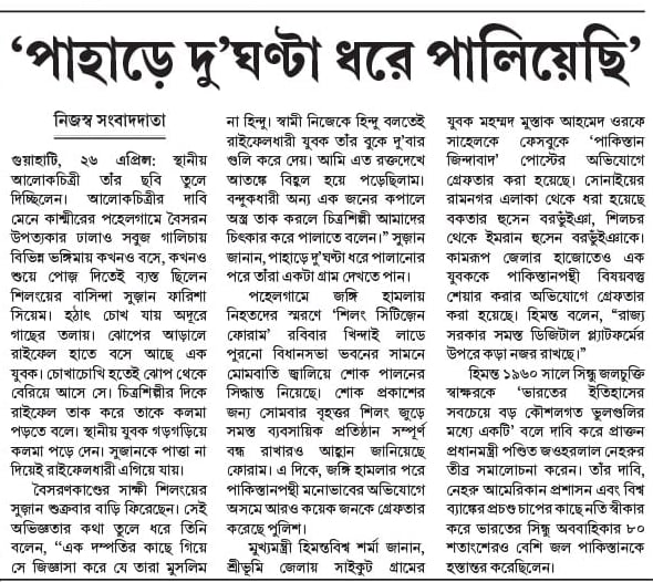 বৈসরণকাণ্ডের সাক্ষী শিলংয়ের সুজ়ান শুক্রবার বাড়ি ফিরেছেন। সেই অভিজ্ঞতার কথা তুলে ধরে তিনি বলেন, ‘‘এক দম্পতির কাছে গিয়ে সে জিজ্ঞাসা করে যে তারা মুসলিম না হিন্দু। স্বামী নিজেকে হিন্দু বলতেই রাইফেলধারী যুবক তাঁর বুকে দু’বার গুলি করে দেয়। আমি এত রক্তদেখে আতঙ্কে বিহ্বল হয়ে পড়েছিলাম। বন্দুকধারী অন্য এক জনের কপালে অস্ত্র তাক করলে চিত্রশিল্পী আমাদের চিৎকার করে পালাতে বলেন।” সুজ়ান জানান, পাহাড়ে দু’ঘণ্টা ধরে পালানোর পরে তাঁরা একটা গ্রাম দেখতে পান।