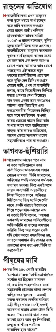 }} রাজনীতিকেরা এখন মানুষের কথা তুলে ধরতে ব্যর্থ হচ্ছেন বলে দাবি করলেন কংগ্রেস নেতা রাহুল গান্ধী। শনিবার হায়দরাবাদে ‘ভারত সামিট ২০২৫’-এ রাহুল বলেছেন, দুনিয়া জুড়ে রাজনীতিতে বদল এসেছে। রাজনীতিকেরা মানুষের ভাবনাকে বুঝতে ব্যর্থ হচ্ছেন। তাদের মধ্যে যে মনোভাব এক দশক আগেও চোখে পড়ত, তা আজ আর চোখে পড়ছে না। এই সময়ে নতুন ধরনের রাজনীতিকের প্রয়োজন বলে যুক্তি দেন তিনি। কংগ্রেস নেতার দাবি, এখন যে রাজনীতি চলছে, তাতে বিরোধীদের নিশ্চিহ্ন করার প্রবণতা দেখা দিয়েছে। যার ফলে একটা সময় কংগ্রেসও আটকা পড়ে গিয়েছিল এবং কংগ্রেসকর্মীরা নিজেদের বিচ্ছিন্ন বলে মনে করছিলেন। তখনই ভারত জোড়ো যাত্রার চিন্তা তাঁর মাথায় আসে বলে জানিয়েছেন রাহুল। তাঁর আরও অভিযোগ, অনেক ক্ষেত্রে সংবাদমাধ্যমের সহযোগিতাও পায় না কংগ্রেস।