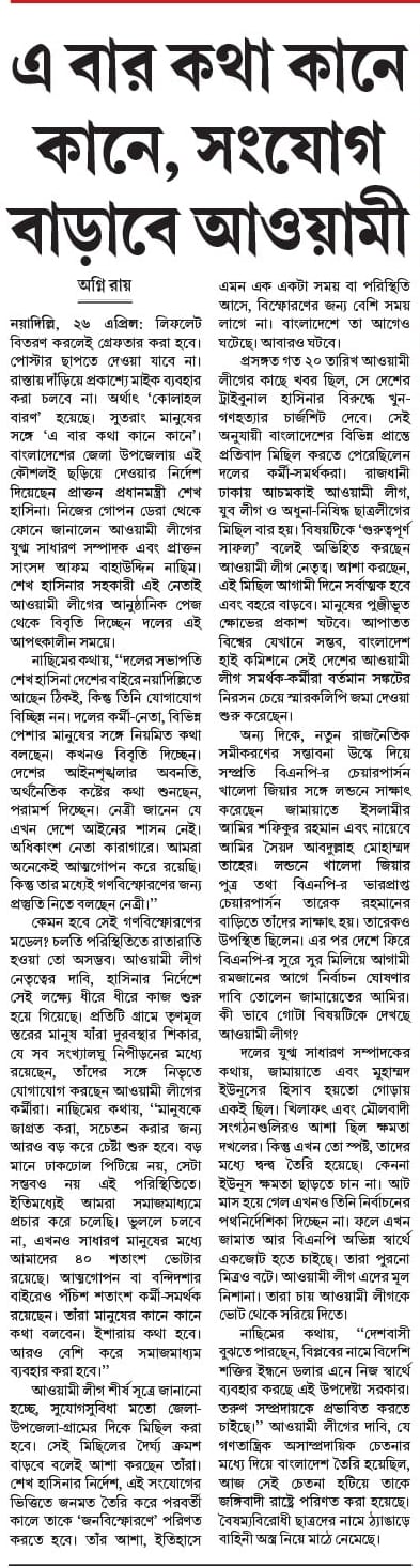 নয়াদিল্লি, ২৬ এপ্রিল: লিফলেট বিতরণ করলেই গ্রেফতার করা হবে। পোস্টার ছাপতে দেওয়া যাবে না। রাস্তায় দাঁড়িয়ে প্রকাশ্যে মাইক ব্যবহার করা চলবে না। অর্থাৎ ‘কোলাহল বারণ’ হয়েছে। সুতরাং মানুষের সঙ্গে ‘এ বার কথা কানে কানে’। বাংলাদেশের জেলা উপজেলায় এই কৌশলই ছড়িয়ে দেওয়ার নির্দেশ দিয়েছেন প্রাক্তন প্রধানমন্ত্রী শেখ হাসিনা। নিজের গোপন ডেরা থেকে ফোনে জানালেন আওয়ামী লীগের যুগ্ম সাধারণ সম্পাদক এবং প্রাক্তন সাংসদ আফম বাহাউদ্দিন নাছিম। শেখ হাসিনার সহকারী এই নেতাই আওয়ামী লীগের আনুষ্ঠানিক পেজ থেকে বিবৃতি দিচ্ছেন দলের এই আপৎকালীন সময়ে।