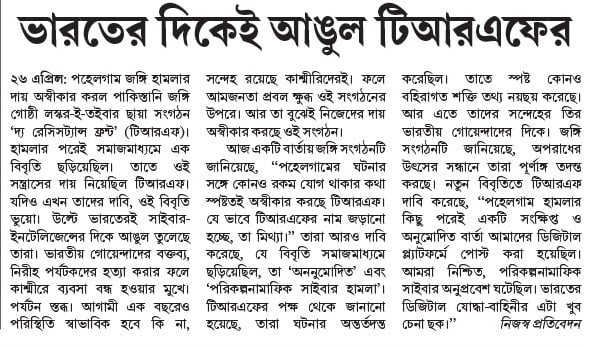 ২৬ এপ্রিল: পহেলগাম জঙ্গি হামলার দায় অস্বীকার করল পাকিস্তানি জঙ্গি গোষ্ঠী লস্কর-ই-তইবার ছায়া সংগঠন ‘দ্য রেসিসট্যান্স ফ্রন্ট’ (টিআরএফ)। হামলার পরেই সমাজমাধ্যমে এক বিবৃতি ছড়িয়েছিল। তাতে ওই সন্ত্রাসের দায় নিয়েছিল টিআরএফ। যদিও এখন তাদের দাবি, ওই বিবৃতি ভুয়ো। উল্টে ভারতেরই সাইবার-ইনটেলিজেন্সের দিকে আঙুল তুলেছে তারা। ভারতীয় গোয়েন্দাদের বক্তব্য, নিরীহ পর্যটকদের হত্যা করার ফলে কাশ্মীরে ব্যবসা বন্ধ হওয়ার মুখে। পর্যটন স্তব্ধ। আগামী এক বছরেও পরিস্থিতি স্বাভাবিক হবে কি না, সন্দেহ রয়েছে কাশ্মীরিদেরই। ফলে আমজনতা প্রবল ক্ষুব্ধ ওই সংগঠনের উপরে। আর তা বুঝেই নিজেদের দায় অস্বীকার করছে ওই সংগঠন।