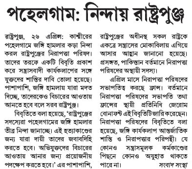 বিবৃতিতে বলা হয়েছে, ‘রাষ্ট্রপুঞ্জের সদস্যেরা পহেলগামের জঙ্গি হামলার তীব্র নিন্দা জানাচ্ছে। এই হত্যাকাণ্ডের জন্য যারা দায়ী তাদের জবাবদিহি করতে হবে। অভিযুক্তদের বিচারের আওতায় আনার জন্য প্রয়োজনীয় পদক্ষেপ করতে হবে।’ এর পাশাপাশি, রাষ্ট্রপুঞ্জের অধীনস্থ সকল রাষ্ট্রকে একত্রে সন্ত্রাসের মোকাবিলায় এগিয়ে আসার আহ্বান জানানো হয়েছে। প্রসঙ্গত, পাকিস্তান বর্তমানে নিরাপত্তা পরিষদের অস্থায়ী সদস্য।
