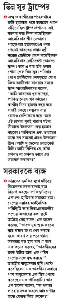 }} জম্মু ও কাশ্মীরের পহেলগামে জঙ্গি হামলার পরে ভারতের পাশে দাঁড়িয়েছিল ট্রাম্প প্রশাসন। এই ঘটনার কড়া নিন্দা করেছিলেন আমেরিকার শীর্ষ নেতারা। পহেলগাম হত্যাকাণ্ডের খবর পেয়েই ভারতের প্রধানমন্ত্রী নরেন্দ্র মোদীকে ফোন করেছিলেন আমেরিকার প্রেসিডেন্ট ডোনাল্ড ট্রাম্প। তবে এ বার তাঁর গলায় শোনা গেল ভিন্ন সুর। শনিবার পোপ ফ্রান্সিসের শেষকৃত্যে যোগ দিতে ভ্যাটিকান যাওয়ার সময়ে ট্রাম্প সাংবাদিকদের বলেন, “আমি ভারতের খুব কাছের, পাকিস্তানেরও খুব কাছের। কাশ্মীর নিয়ে হাজার বছর ধরে লড়াই চলছে। সম্ভবত তার