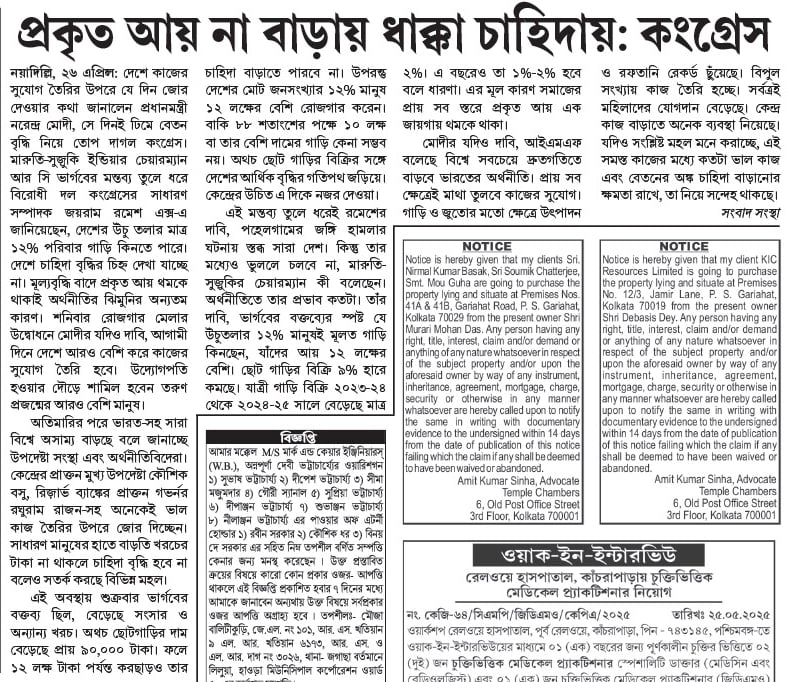 নয়াদিল্লি, ২৬ এপ্রিল: দেশে কাজের সুযোগ তৈরির উপরে যে দিন জোর দেওয়ার কথা জানালেন প্রধানমন্ত্রী নরেন্দ্র মোদী, সে দিনই ঢিমে বেতন বৃদ্ধি নিয়ে তোপ দাগল কংগ্রেস। মারুতি-সুজ়ুকি ইন্ডিয়ার চেয়ারম্যান আর সি ভার্গবের মন্তব্য তুলে ধরে বিরোধী দল কংগ্রেসের সাধারণ সম্পাদক জয়রাম রমেশ এক্স-এ জানিয়েছেন, দেশের উঁচু তলার মাত্র ১২% পরিবার গাড়ি কিনতে পারে। দেশে চাহিদা বৃদ্ধির চিহ্ন দেখা যাচ্ছে না। মূল্যবৃদ্ধি বাদে প্রকৃত আয় থমকে থাকাই অর্থনীতির ঝিমুনির অন্যতম কারণ। শনিবার রোজগার মেলার উদ্বোধনে মোদীর যদিও দাবি, আগামী দিনে দেশে আরও বেশি করে কাজের সুযোগ তৈরি হবে। উদ্যোগপতি হওয়ার দৌড়ে শামিল হবেন তরুণ প্রজন্মের আরও বেশি মানুষ।