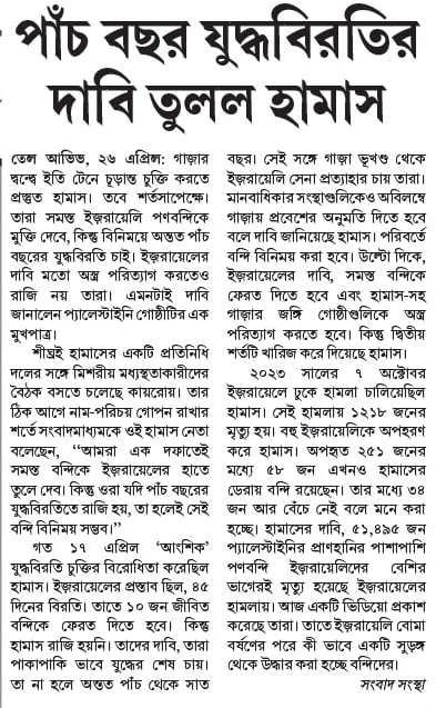 গত ১৭ এপ্রিল ‘আংশিক’ যুদ্ধবিরতি চুক্তির বিরোধিতা করেছিল হামাস। ইজ়রায়েলের প্রস্তাব ছিল, ৪৫ দিনের বিরতি। তাতে ১০ জন জীবিত বন্দিকে ফেরত দিতে হবে। কিন্তু হামাস রাজি হয়নি। তাদের দাবি, তারা পাকাপাকি ভাবে যুদ্ধের শেষ চায়। তা না হলে অন্তত পাঁচ থেকে সাত বছর। সেই সঙ্গে গাজ়া ভূখণ্ড থেকে ইজ়রায়েলি সেনা প্রত্যাহার চায় তারা। মানবাধিকার সংস্থাগুলিকেও অবিলম্বে গাজ়ায় প্রবেশের অনুমতি দিতে হবে বলে দাবি জানিয়েছে হামাস। পরিবর্তে বন্দি বিনিময় করা হবে। উল্টো দিকে, ইজ়রায়েলের দাবি, সমস্ত বন্দিকে ফেরত দিতে হবে এবং হামাস-সহ গাজ়ার জঙ্গি গোষ্ঠীগুলিকে অস্ত্র পরিত্যাগ করতে হবে। কিন্তু দ্বিতীয় শর্তটি খারিজ করে দিয়েছে হামাস।