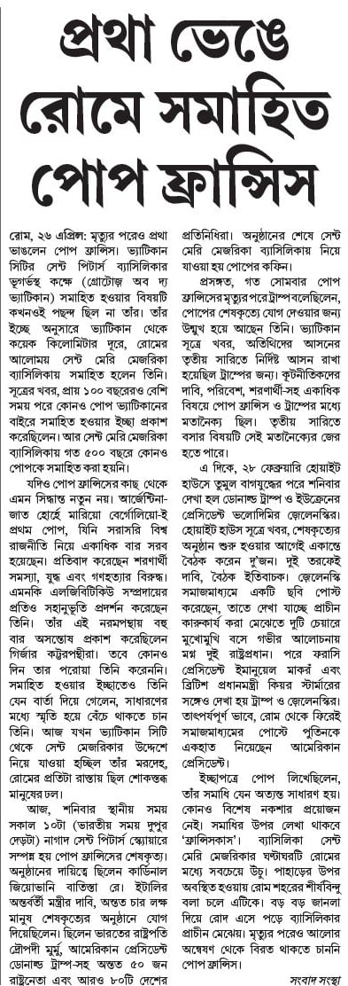 যেন বার্তা দিয়ে গেলেন, সাধারণের মধ্যে স্মৃতি হয়ে বেঁচে থাকতে চান তিনি। আজ যখন ভ্যাটিকান সিটি থেকে সেন্ট মেজরিকার উদ্দেশে নিয়ে যাওয়া হচ্ছিল তাঁর মরদেহ, রোমের প্রতিটা রাস্তায় ছিল শোকস্তব্ধ
