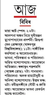 মায়া আর্ট স্পেস: ২-৮টা। আলপনা অঙ্কন নিয়ে সুধীরঞ্জন মুখোপাধ্যায়ের প্রদর্শনী। ত্রিগুণা সেন প্রেক্ষাগৃহ (যাদবপুর বিশ্ববিদ্যালয়): ১১টা। সাঙ্গীতিক কর্মশালা ও আলোচনাচক্র। ভাবনা, পরিকল্পনা ও পরিচালনা- অগ্নিভ বন্দ্যোপাধ্যায়। আয়োজনে অভিজ্ঞান। কলাভৃৎ পরশমণি (বন্ডেল রোড): ৭টা। গানমালা। পরিচালনা- অলক রায়চৌধুরী ও অনিন্দ্য বন্দ্যোপাধ্যায়। উত্তম মঞ্চ: ৬টা। রবীন্দ্রসঙ্গীতে সৌমী ও শ্রুতি নাহা। আয়োজনে ভাবনা রেকর্ডস অ্যান্ড ক্যাসেটস।
