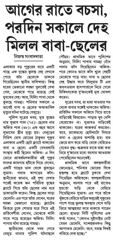 পুলিশ সূত্রের খবর, মৃত বৃদ্ধের নাম সুভাষ পাল (৭৫)। ছেলের নাম অজিত পাল (৩৮)। এক বছর আগে সুভাষের স্ত্রীর মৃত্যু হয়। বেলুড়ের গিরিশ ঘোষ রোডের ঠাকুরন পুকুর এলাকার একটি ছোট ফ্ল্যাটে থাকতেন বাবা ও ছেলে। একটি বেসরকারি সংস্থার কর্মী ছিলেন অজিত। এ দিন ভোরে প্রাতর্ভ্রমণকারীরা ওই পুকুর সংলগ্ন জায়গায় হাঁটতে গিয়ে দেখেন, একটি গাছের ডাল থেকে ঝুলছেন সুভাষ। গলায় কাপড়ের ফাঁস। স্থানীয়েরা জানান, ওই দৃশ্য দেখার পরেই কয়েক জন পরিচিত বৃদ্ধের ফ্ল্যাটে গিয়ে তাঁর ছেলের নাম ধরে ডাকাডাকি করেন। কিন্তু ছেলের সাড়া মেলেনি। এর পরে তাঁরা দেখেন, ঘরের দরজা ভেজানো রয়েছে। ফ্ল্যাটের ভিতরে ঢুকে শোয়ার ঘরে গিয়ে ওই প্রতিবেশীরা দেখেন, মেঝেতে খালি গায়ে পড়ে রয়েছেন অজিত। সিলিং পাখায় বাঁধা রয়েছে গামছা।