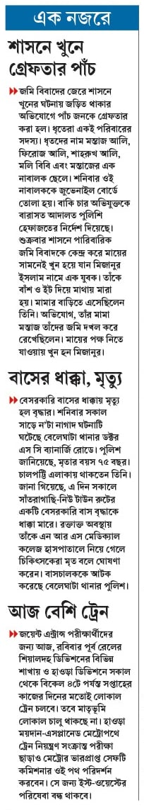 }} জমি বিবাদের জেরে শাসনে খুনের ঘটনায় জড়িত থাকার অভিযোগে পাঁচ জনকে গ্রেফতার করা হল। ধৃতেরা একই পরিবারের সদস্য। ধৃতদের নাম মন্তাজ আলি, ফিরোজ আলি, শাহরুখ আলি, মলি বিবি এবং মন্তাজের এক নাবালক ছেলে। শনিবার ওই নাবালককে জুভেনাইল বোর্ডে তোলা হয়। বাকি চার অভিযুক্তকে বারাসত আদালত পুলিশি হেফাজতের নির্দেশ দিয়েছে। শুক্রবার শাসনে পারিবারিক জমি বিবাদকে কেন্দ্র করে মায়ের সামনেই খুন হয়ে যান মিজানুর ইসলাম নামে এক যুবক। তাঁকে বাঁশ ও ইট দিয়ে মাথায় মারা হয়। মামার বাড়িতে এসেছিলেন তিনি। অভিযোগ, তাঁর মামা মন্তাজ তাঁদের জমি দখল করে রেখেছিলেন। মায়ের পক্ষ নিতে যাওয়ায় খুন হন মিজানুর।